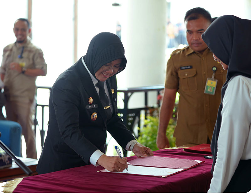 Siak (Outsiders) – Bupati Siak Afni Zulkifli menyerahkan Surat Keputusan (SK) pengangkatan Calon Pegawai Negeri Sipil (CPNS) dan Pegawai Pemerintah Dengan Perjanjian Kerja (PPPK) di lingkungan Kabupaten Siak, Selasa (1/7/2025).