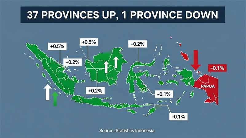 Jakarta (Outsiders) – Badan Pusat Statistik mencatat sebanyak 37 provinsi mengalami kenaikan Indeks Perkembangan Harga (IPH) pada minggu kedua Desember 2025, sementara satu provinsi mengalami penurunan dibandingkan bulan sebelumnya.