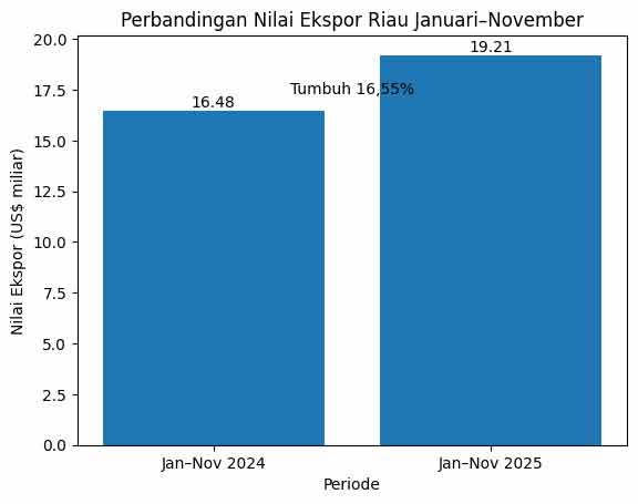 Kepala BPS Provinsi Riau Asep Riyadi mengatakan pertumbuhan ekspor tersebut terutama ditopang sektor nonmigas yang tumbuh 21,18 persen. Nilai ekspor nonmigas tercatat sebesar US$18,16 miliar, meningkat dibandingkan periode yang sama tahun lalu.