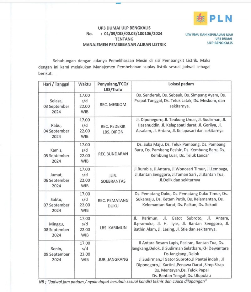 Ia menjelaskan bahwa pemadaman ini dilakukan secara bergilir di wilayah kerja Pulau Bengkalis, sesuai jadwal yang telah ditentukan oleh PLN.