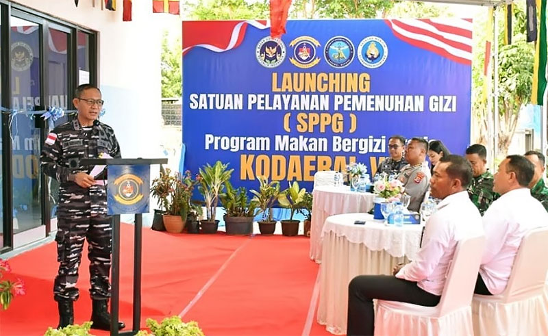 Kupang (Outsiders) – Komando Daerah TNI Angkatan Laut (Kodaeral) VII meluncurkan Satuan Pelayanan Pemenuhan Gizi (SPPG) sebagai bagian dari Program Makan Bergizi Gratis (MBG) yang digagas Badan Gizi Nasional. Kegiatan peresmian berlangsung di Dapur MBG Lanudal Kupang, Senin (29/9/2025), dipimpin langsung oleh Komandan Kodaeral VII Laksamana Muda TNI Joni Sudianto, CHRMP., M.Tr.Opsla.