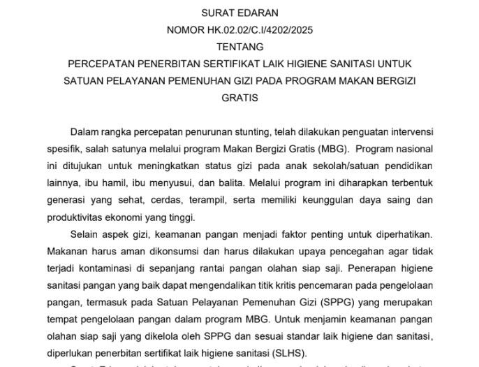 Jakarta (Outsiders) – Kementerian Kesehatan (Kemenkes) mewajibkan seluruh Satuan Pelayanan Pemenuhan Gizi (SPPG) dalam Program Makan Bergizi Gratis (MBG), termasuk di Provinsi Riau, memiliki Sertifikat Laik Higiene Sanitasi (SLHS). Ketentuan tersebut tertuang dalam Surat Edaran (SE) Nomor HK.02.02/C.I/4202/2025 yang ditandatangani pada 1 Oktober 2025.