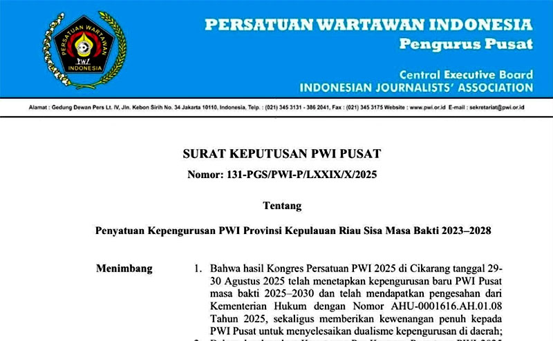Jakarta (Outsiders) – Persatuan Wartawan Indonesia (PWI) Pusat secara resmi menetapkan Saiban Dardani sebagai Ketua PWI Provinsi Kepulauan Riau (Kepri) melalui Surat Keputusan Nomor 131-PGS/PWI-P/LXXIX/X/2025 tentang Penyatuan Kepengurusan PWI Provinsi Kepri Sisa Masa Bakti 2023–2028.