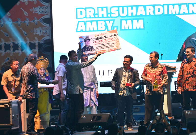 Teluk Kuantan (Outsiders) – Bupati Kabupaten Kuantan Singingi, Suhardiman Amby menyerahkan bonus umroh bagi Pemenang Lomba Karya Tulis Jurnalistik (LKTJ) Raja Ali Kelana kepada Jurfrison pada malam puncak peringatan Hari Pers Nasional (HPN) Tingkat Provinsi Riau Tahun 2024 di Kabupaten Kuantan Singingi (Kuansing) yang berlangsung semarak, Sabtu (20/7) malam, acara ini berlangsung di Lapangan Limuno Teluk Kuantan.