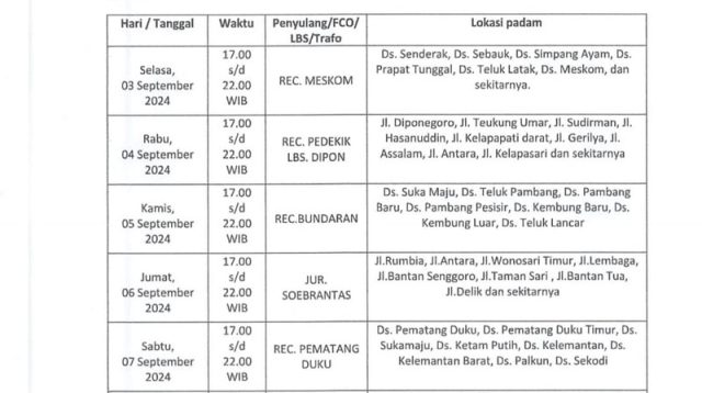 Manager PT PLN (Persero) ULP Bengkalis, M Ashqalany Aulia Rahman mengatakan guna meningkatkan meningkatkan keandalan sistem pembangkit di sistem isolated Pulau Bengkalis, PT PLN (Persero) ULP Bengkalis akan melakukan pemadaman bergilir selama 20 hari ke depan.