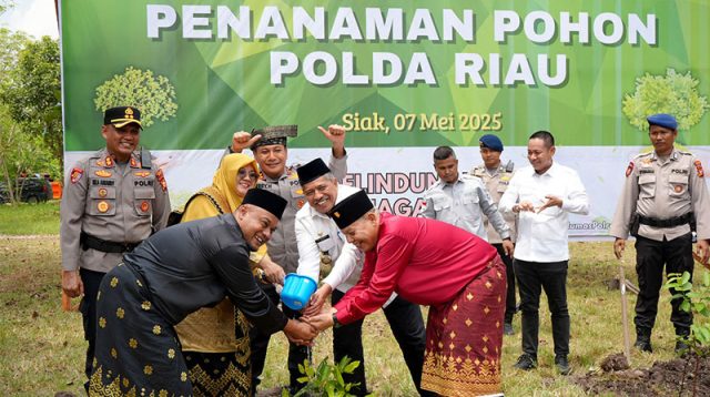 Penanaman 1000 pohon dengan tema “Melindungi Tuah, Menjaga Marwah” sebagai dukungan Kabupaten Hijau oleh Kapolda Riau, Irjen Pol Herry Heryawan disambut Bupati Siak, Alfedri di Bumi Perkemahan Pramuka Tengku Buang Asmara, Kelurahan Sungai Mempura, Kecamatan Mempura, Rabu (7/5/2025).