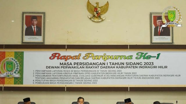 DPRD Kabupaten Indragiri Hilir menggelar Rapat Paripurna Perdana masa sengketa ke-I, T.A 2023 di ruang Paripurna DPRD Inhil, Jl. Soebrantas, Tembilahan, Senin, (1/2/2023).