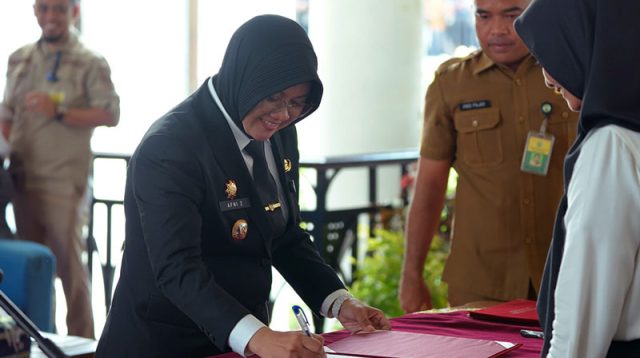 Bupati Siak Afni Zulkifli menyerahkan Surat Keputusan (SK) pengangkatan Calon Pegawai Negeri Sipil (CPNS) dan Pegawai Pemerintah Dengan Perjanjian Kerja (PPPK) di lingkungan Kabupaten Siak, Selasa (1/7/2025).