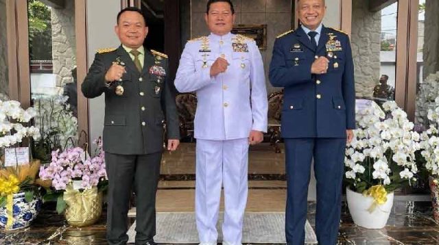 Tiga pimpinan matra TNI berkumpul di kediaman Kepala Staf Angkatan Darat (KSAD) Jenderal TNI Dudung Abdurrahman usai mengikuti pidato kenegaraan Presiden Joko Widodo (Jokowi), Selasa (16/8/2022). Selain KSAD ada Kepala Staf Angkatan Laut (KSAL) Laksamana Yudo Margono dan Kepala Staf Angkatan Udara (KSAU) Marsekal Fadjar Prasetyo dalam pertemuan itu.