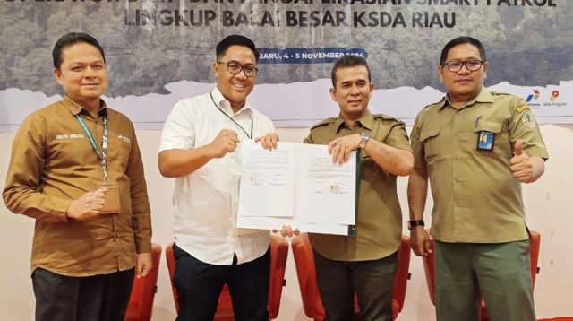 Dukung Konservasi, bersama mitra LPPM UMRI, PT Pertamina Hulu Rokan (PHR) bantuan perangkat patroli pintar (Smart Patrol) yang diterima langsung oleh Kepala BBKSDA Riau Genman Suhefti Hasibuan di acara pembukaan Bimbingan Teknis Operator Data dan Pengaplikasian Smart Patrol Lingkup Balai Besar Konservasi Sumber Daya Alam (BBKSDA) Riau, Pekanbaru, Senin (4/11/2024).